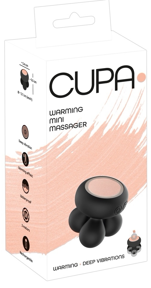 Warming Mini Massager de la CUPA este un vibrator compact zămislit pentru recreere şi stârnire locală. Dispozitivul are două capete distincte — un capăt cu mase sferice pentru vibraţii profunde şi un capăt plat cu funcţie de încălzire — şi rulează 10 feluri de vibraţie alimentate de 4 motoare, fiecare controlabil separat.