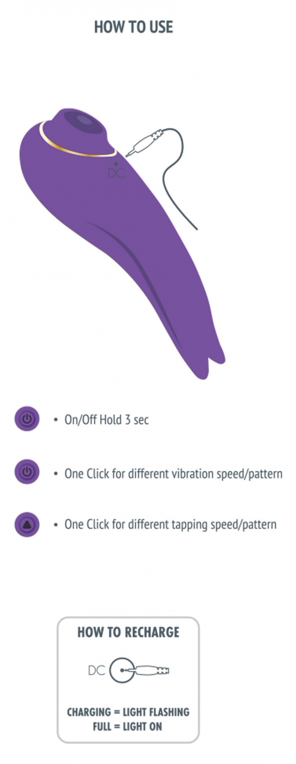 Stimulator SalsaTap mov, cu tehnologie de tapping pentru stârnire precisă a clitorisului. Reîncărcabil (Li‑Ion), două motoare, 10 tipuri de vibrații și 3 nivele de viteză. Până la 60 min autonomie, rezistent la apă, compact și ușor de folosit.