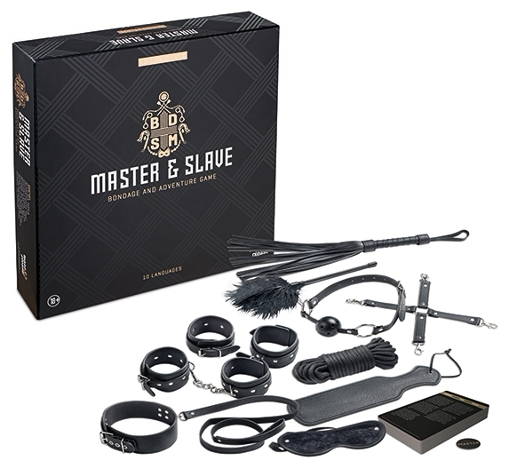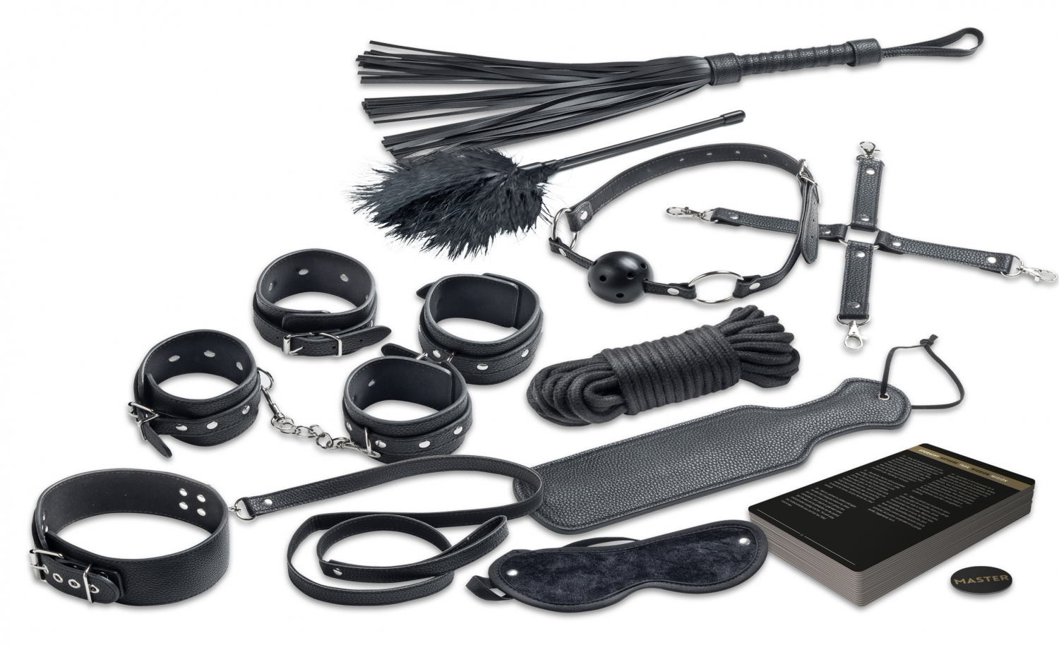 Set Master Submisie Deluxe de la Tease & Please, colet perfect pentru jocuri de putere: bici, mască pentru ochi, padel, zgardă, pene, manșete pentru încheieturi și glezne, cordon și accesorii. 24 cartonașe cu instrucțiuni în 10 limbi.