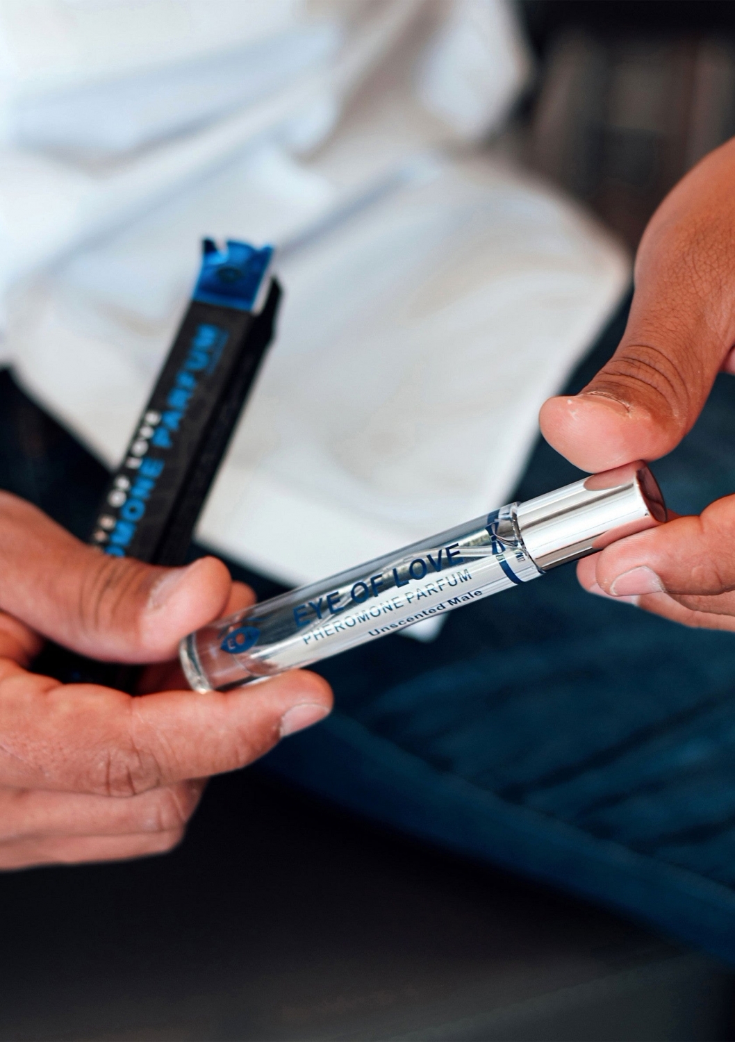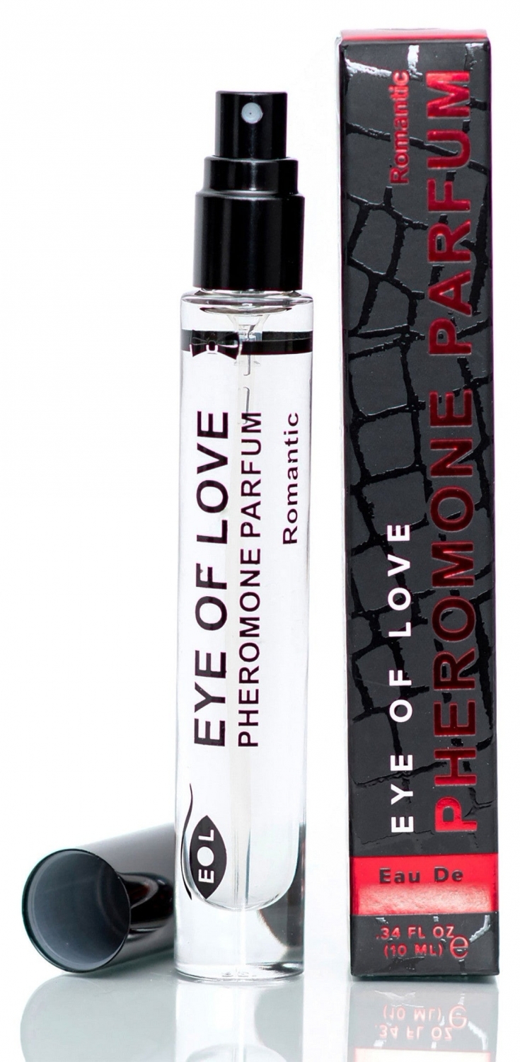 Parfum cu hormoni de atracție Eye of Love 10 ml, compact și discret. Disponibil în două variante: Confidence (mosc, miere, iasomie, vanilie) și Romantic (mușchi de stejar, lemongrass, santal, iasomie). Aplicare punctuală pe încheieturi sau guler.