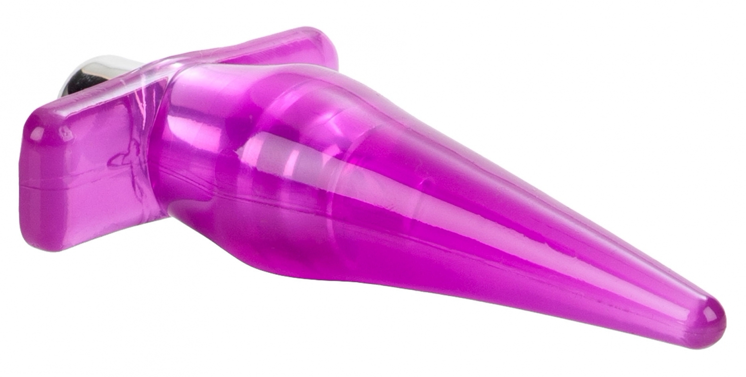 Plug anal compact CalExotics, corp din TPR transparent, inserabil 9.5 cm. Modul vibrator detașabil cu 2 moduri, flanșă de certitudine și baterii AG4/LR626 incluse. Impermeabil și ușor de curățat — discret, perfect pentru începători și călătorii.