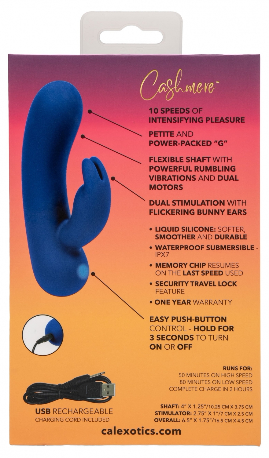 Vibrator CalExotics Cashmere Silk Bunny, dual motor, 10 moduri, silicon lichid catifelat, vârf pentru zonă G și urechi stimulate. Rezistent IPX7, cu acumulator USB, memorie și blocare de transport. Până la 80 minute autonomie.