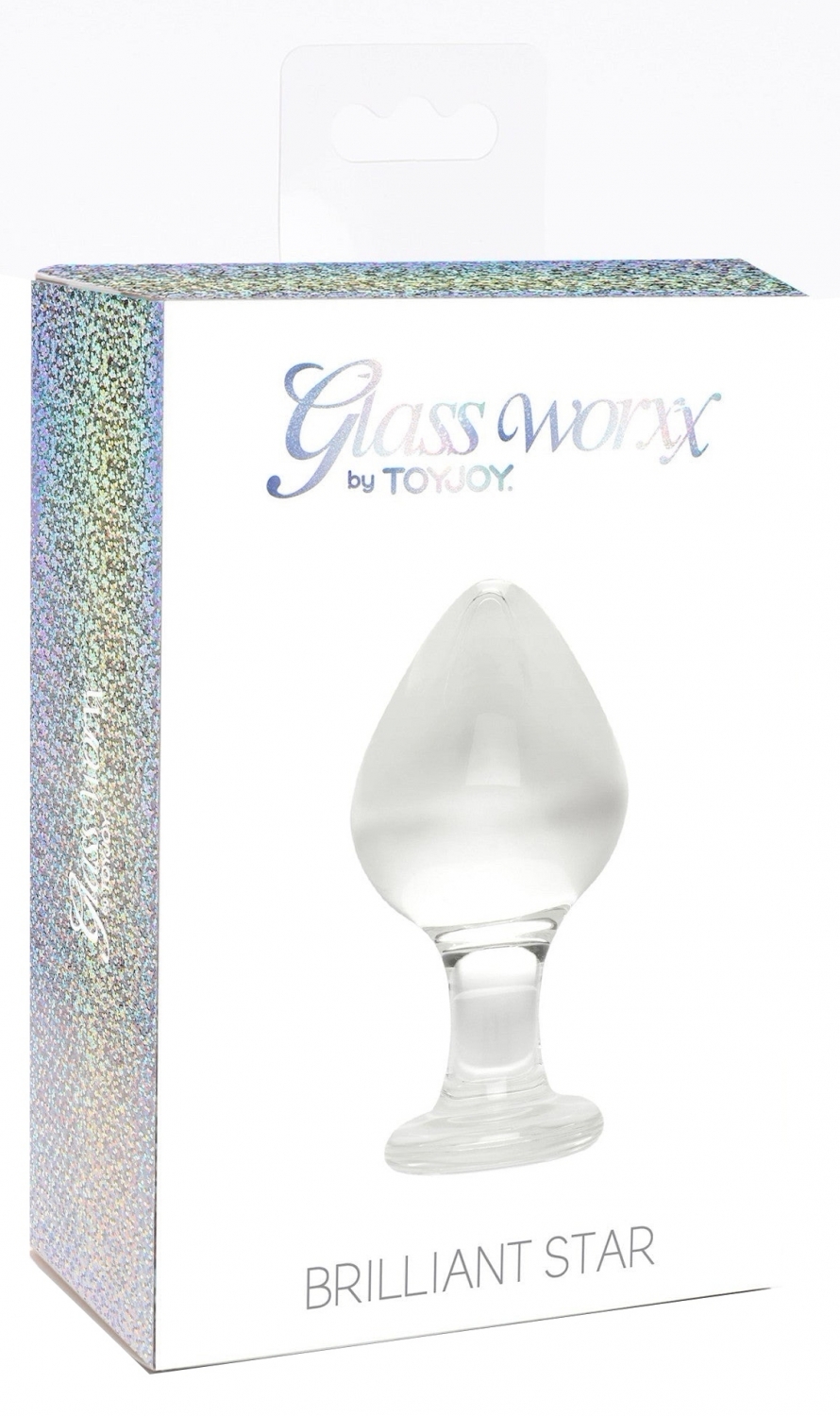 Plug anal din sticlă TOYJOY Brilliant Star: vârf bulb, bază flared pentru siguranţă, suprafaţă netedă, hipoalergenică și rezistentă. Corespunzător pentru jocuri cu temperatură. Inserabil 6.5 cm, diametru 4 cm.