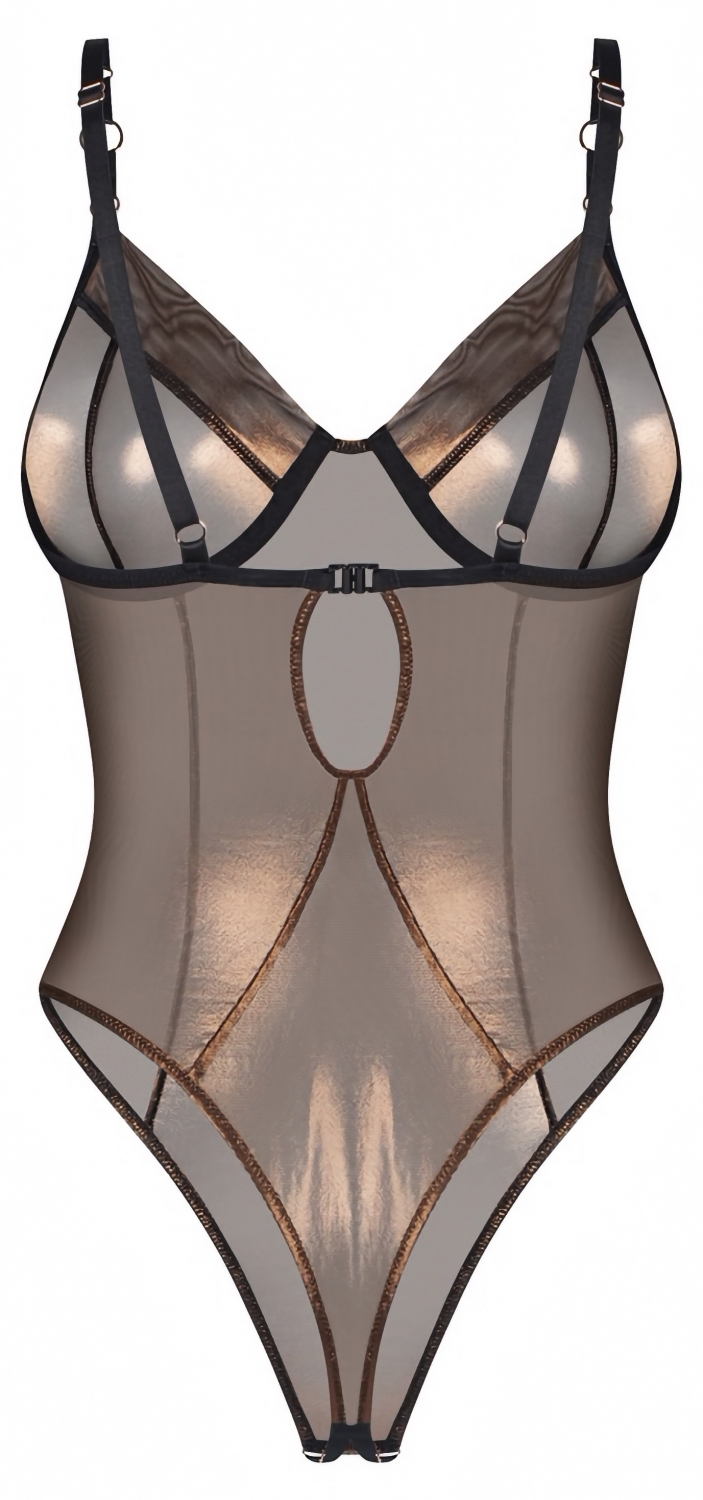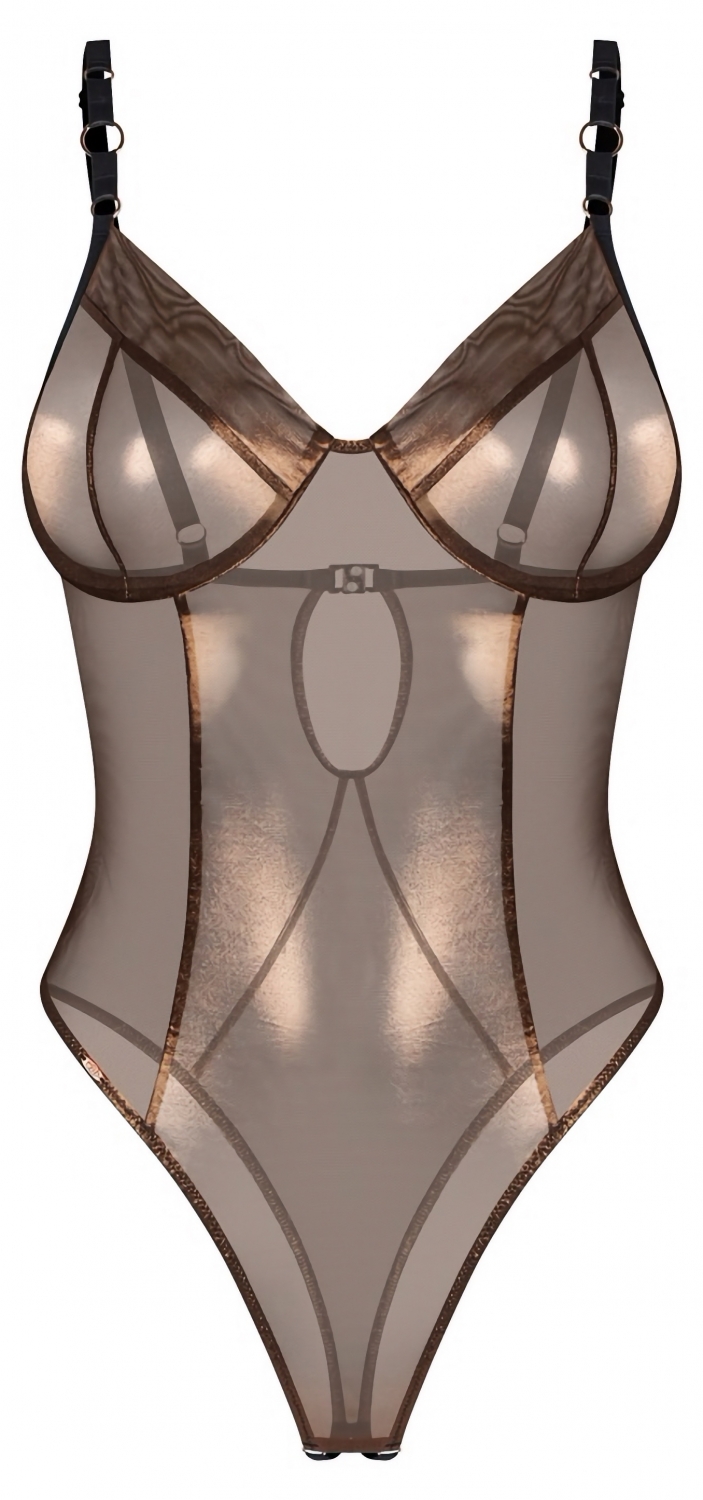 Body Soranna asigură un finisaj bronze, ușor translucid, cu o sclipire discretă care avantajează linia corpului. Designul în stil tanga, cu tăietură înaltă și decupare inghinal, subliniază silueta fără a sacrifica confortul.