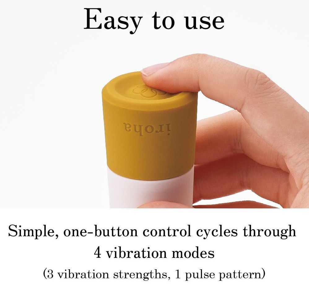 Iroha RIN Kogane de la Tenga — vibrator compact din silicon şi ABS. Vârf sferic flexibil, 3 intensităţi şi 1 mod ritmic, rezistent la apă 50 cm. Funcţionează cu 2x AAA.