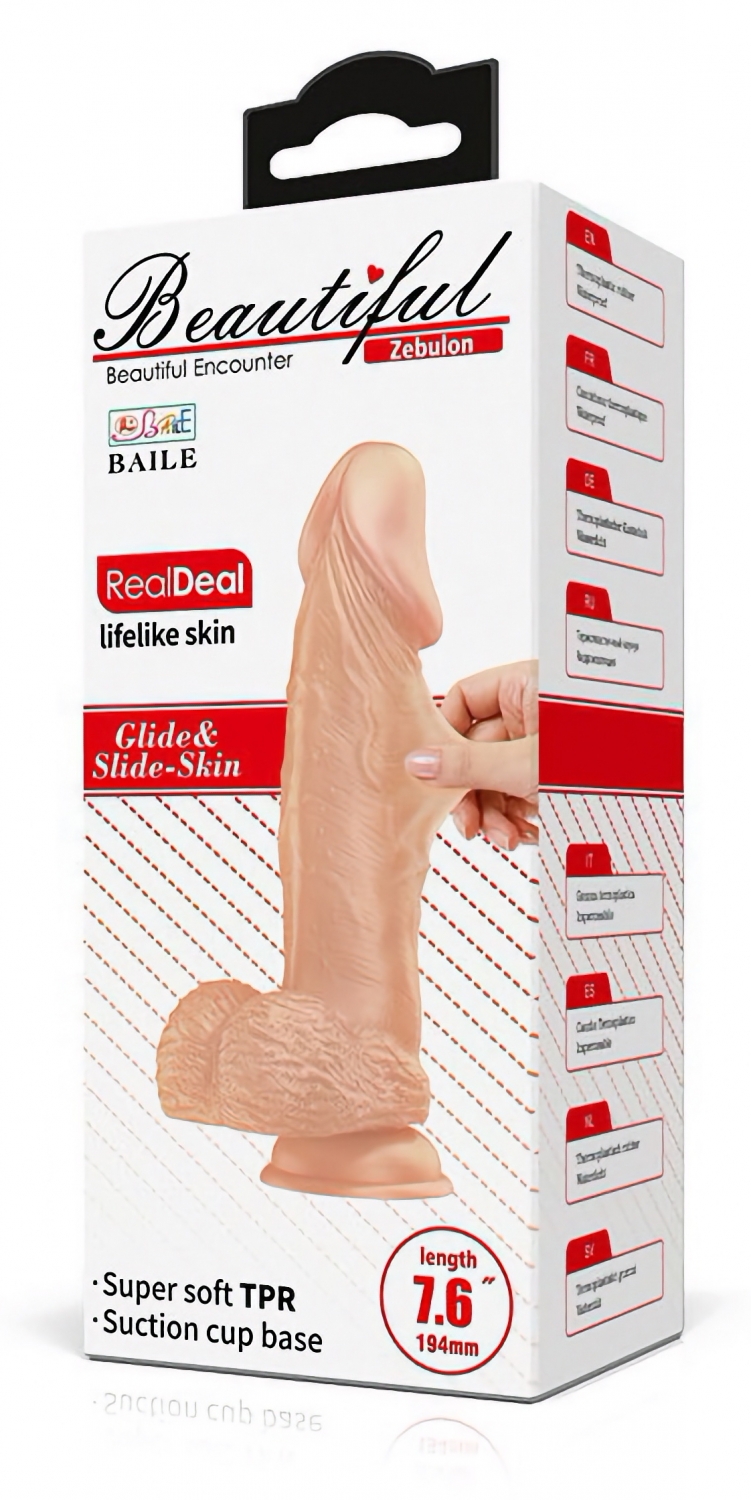 Replica realistă Baile Zebulon - 24 cm total, 18 cm inserabil, diametru 5 cm. Exterior TPR neted și miez ferm pentru stabilitate. Ventuză robustă pentru fixare hands-free. Rezistent la apă, ușor de curățat.