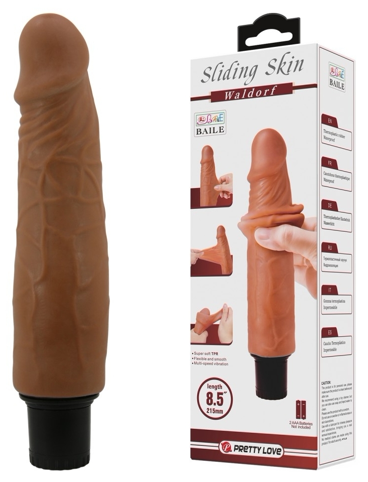 Vibrator realist Debra Sliding Skin Waldorf, 21 cm, din TPR și ABS. Cap bulbos, shaft venos și bază texturată. Ventuză puternică, vibrații reglabile. Funcționează cu 2 baterii AAA. Ușor de utilizat și curățat.