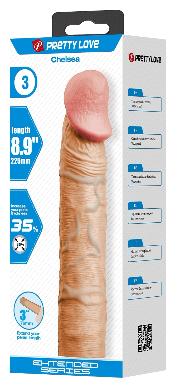 Manșon realist Pretty Love Chelsey, mărime nefragmentată 22,5 cm; crește +7,6 cm la penetrare și mărește circumferința până la 35%. Material TPR flexibil, texturat, rezistent la apă pentru contact confortabil și stimulare intensă.