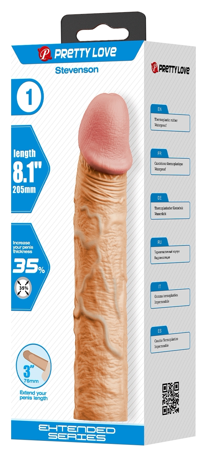 Cilindru extensie Pretty Love Stevenson din TPR ultra-realist, lungime 20,5 cm, cu vene texturate și cap rotunjit. Interior neted pentru atingere mare și stimulare. Rezistent la apă; colorit maro (flesh).