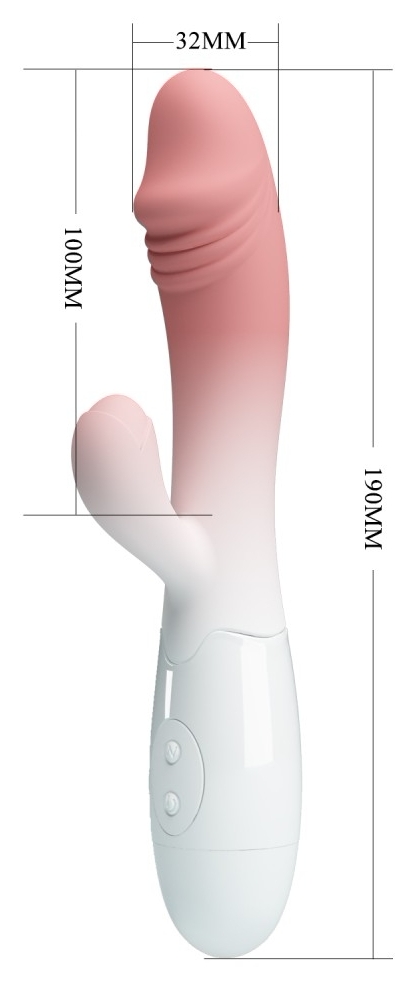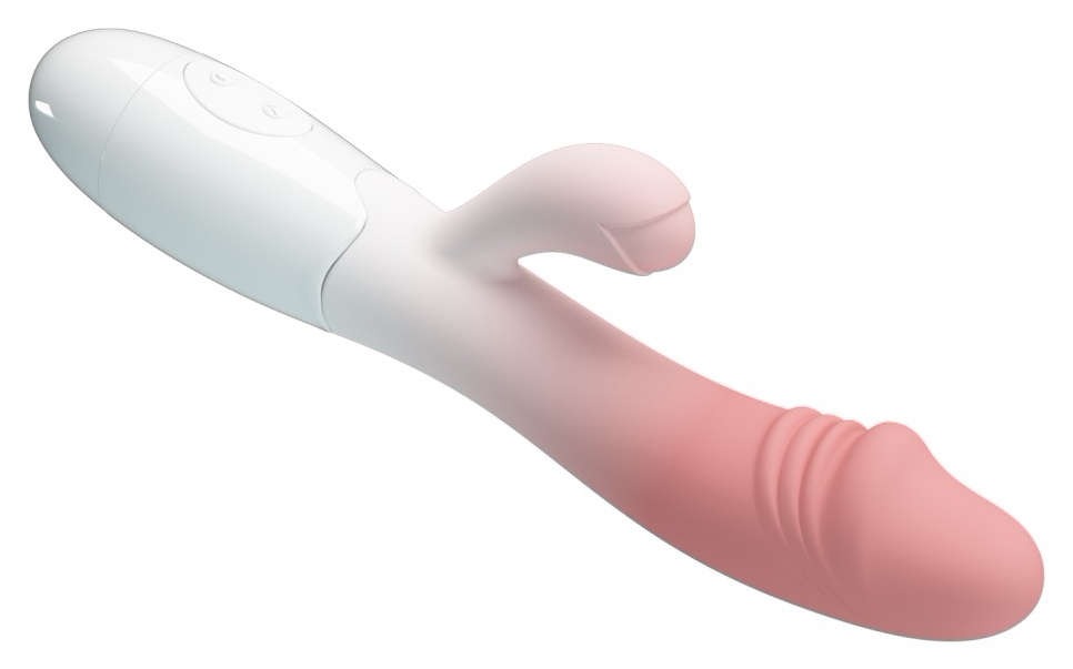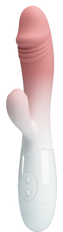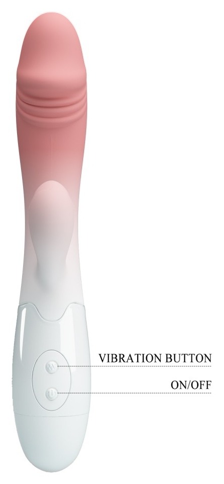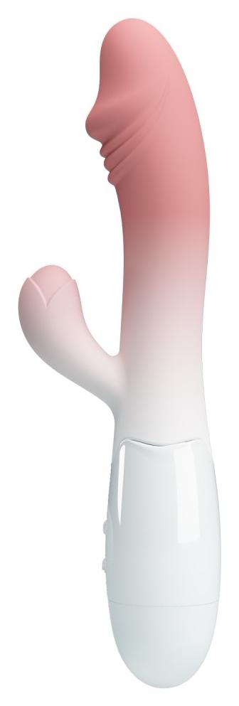 Vibrator Pretty Love Snappy, din silicon, cu 30 de moduri de vibrație pentru stimulare duală de clitoris și vaginală. Design ergonomic optimizat roz/alb, neted, discret și ușor de folosit și curățat.