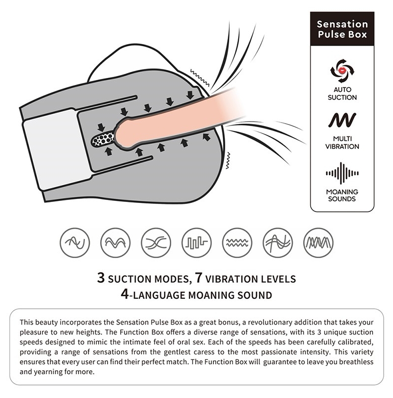 Designul ergonomic optimizat și materialul prudent ales oferă o senzație naturală; cele 3 trepte de aspirație și cele 7 frecvențe de vibrație consimt reglaje fine pentru preferințe variate. Elasticitatea materialului se adaptează în timp, ceea ce poate face intrarea mai lejeră la utilizările ulterioare.