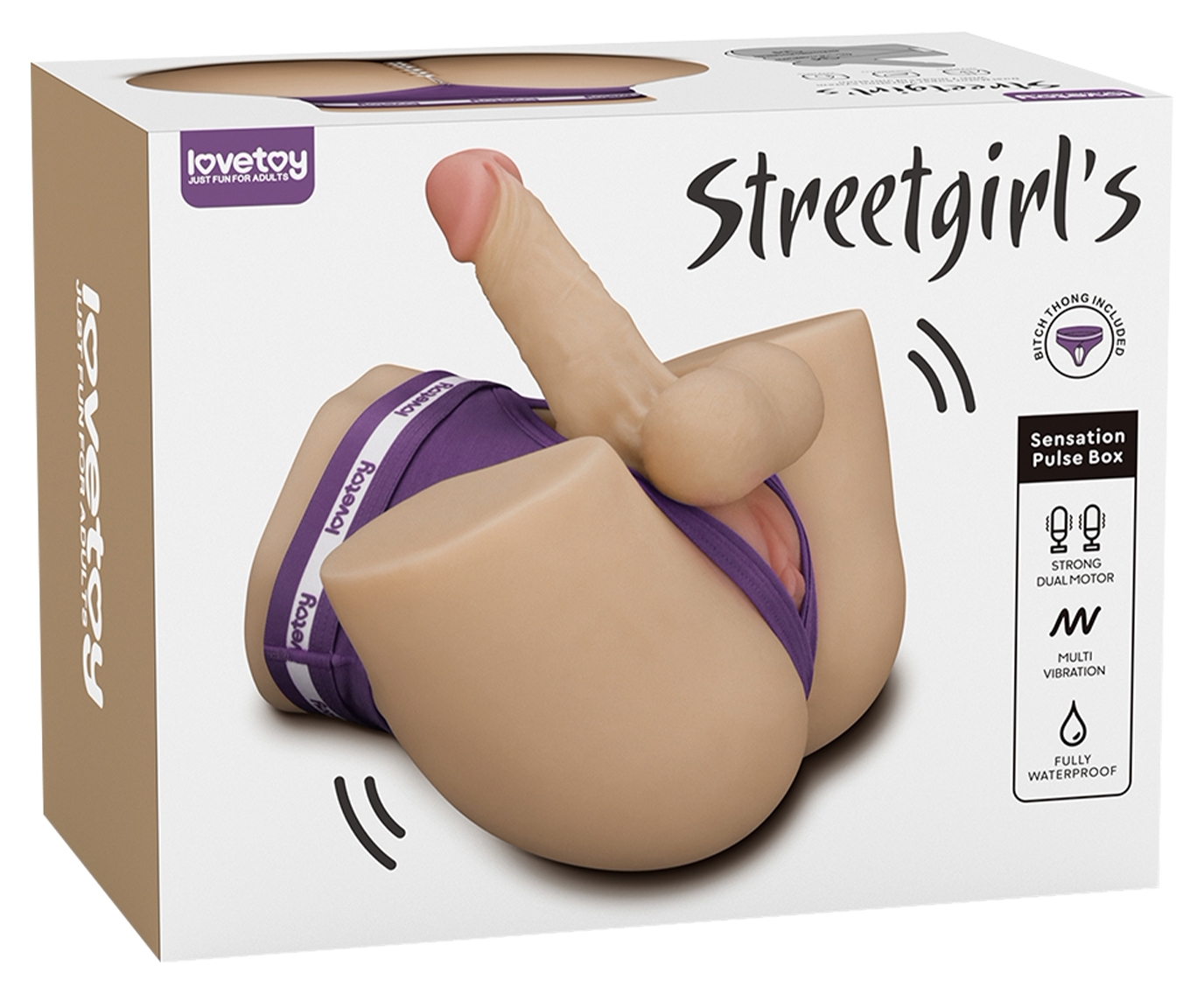 LoveToy Streetgirl: Dual Motor cu vibrații intense Sensation Pulse. Canal realist și dildo integrat, complet tenace la apă. ștergere ușoară. Include chilot cu ață Boudoir. Dim: 19.5×25.5×15 cm, 2.62 kg.
