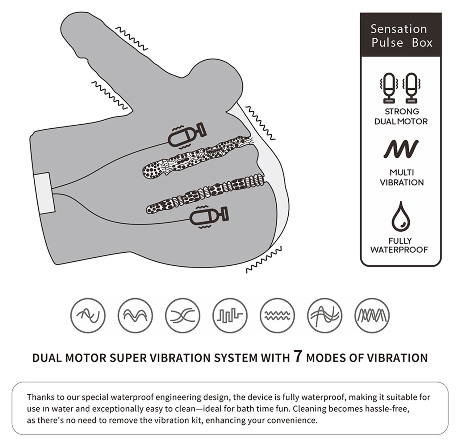Carcasa conține un canal realizat realist și un dong integrat, pentru emoții convingătoare și consistente. Produsul este perfect rezistent la apă, ceea ce îl face adecvat pentru utilizare în medii umede și foarte ușor de purificat — nu este necesară demontarea modulului de vibrație.