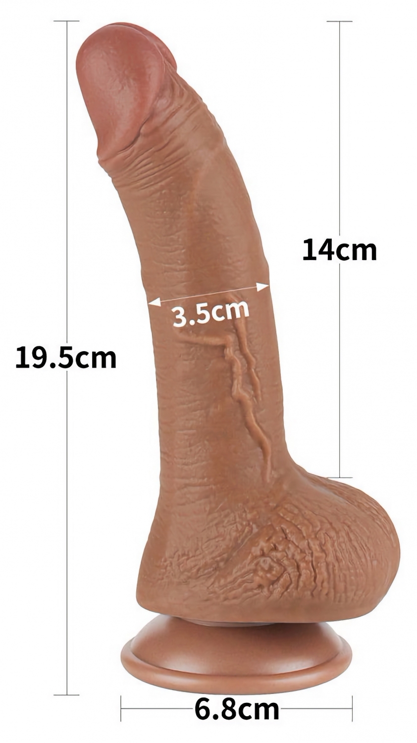Material Sliding Skin dual layer: exterior moale și miez ferm. Extindere 19.5 cm, diametru 3.5 cm. Ventuză detașabilă pentru stabilizare stabilă. Utilizați material lubrifiere pe bază de apă; curățați cândva și după fiecare utilizare.