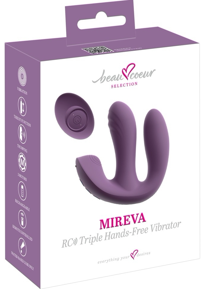 MIREVA RC Triple de la beau coeur este un aparat hands-free, proiectat adaptiv pentru a dărui stârnire simultană a părții interne, a clitorisului și a zonei anale. Fiecare zonă are un tip de acțiune dedicat: mișcări de împingere pentru porțiunea internă, impulsuri ritmice pentru clitoris și reverberații profunde pentru zona anală.