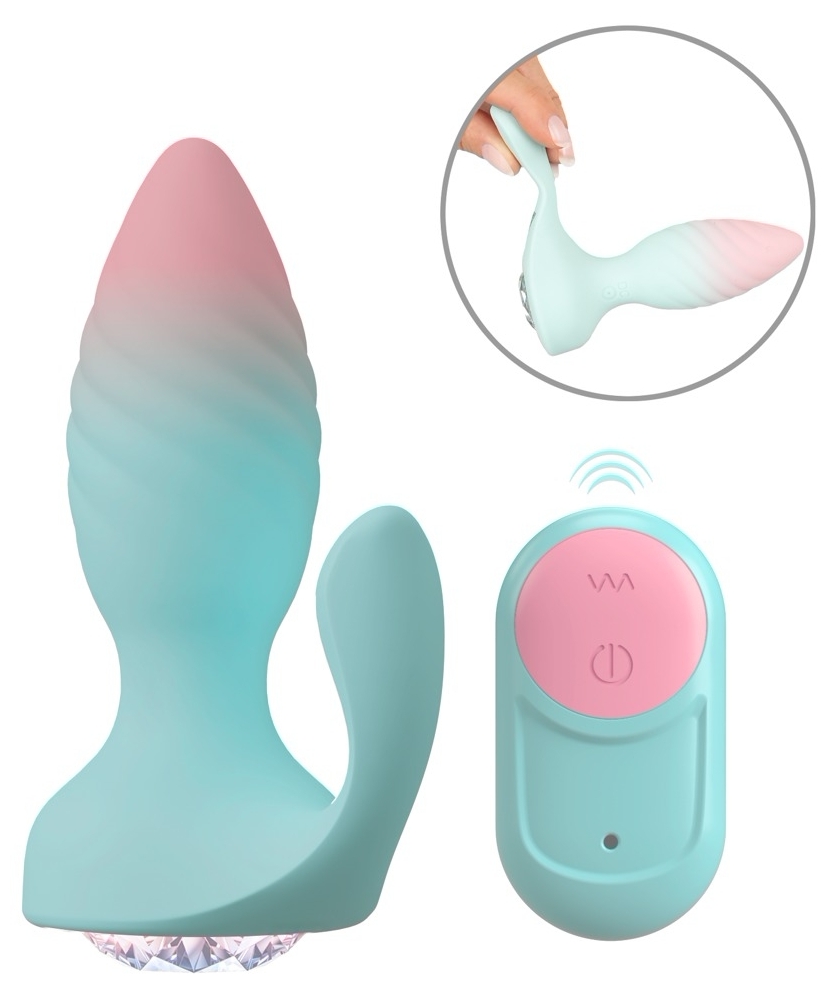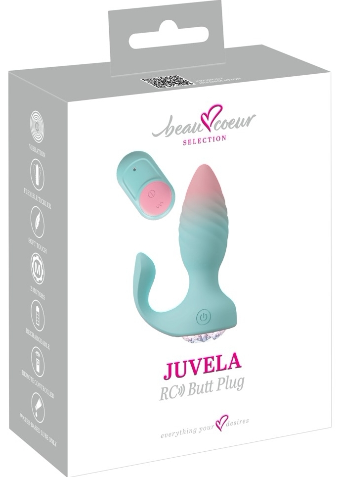 Plug anal JUVELA RC de la beau coeur: 2 motoare independente, 10 moduri de vibraţie, cu acumulator cu cablul USB şi telecomandă (rază până la 10 m). Silicon catifelat, siluetă conică şi braţ elastic pentru fixare confortabilă.