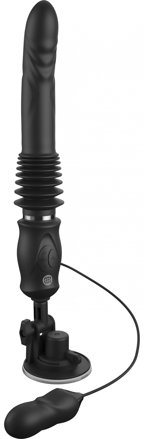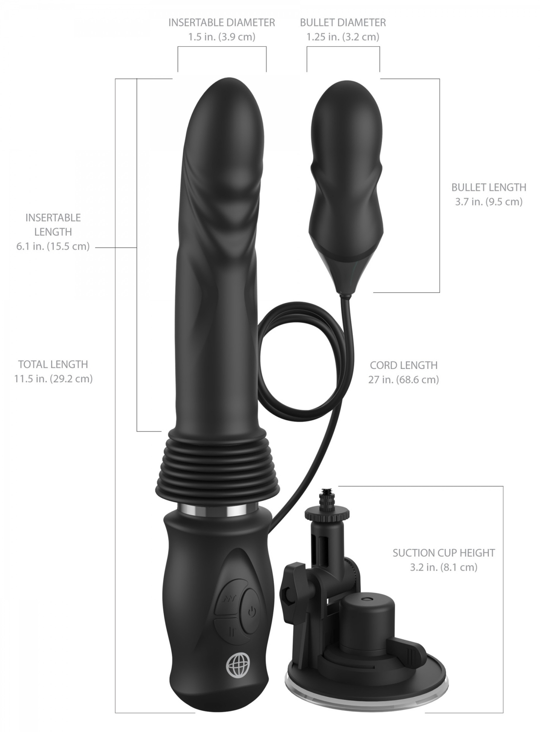 Vibrator de împingere Pipedream cu curs de 7.6 cm, 3 viteze de împingere și 10 chipuri de vibrație. Conține mini-vibrator conectat prin cablu de 69 cm, cupă ventuză detașabilă, materii din silicon Elite și ABS, cu acumulator USB C. Curățare simplă cu apă caldă și detergent special.