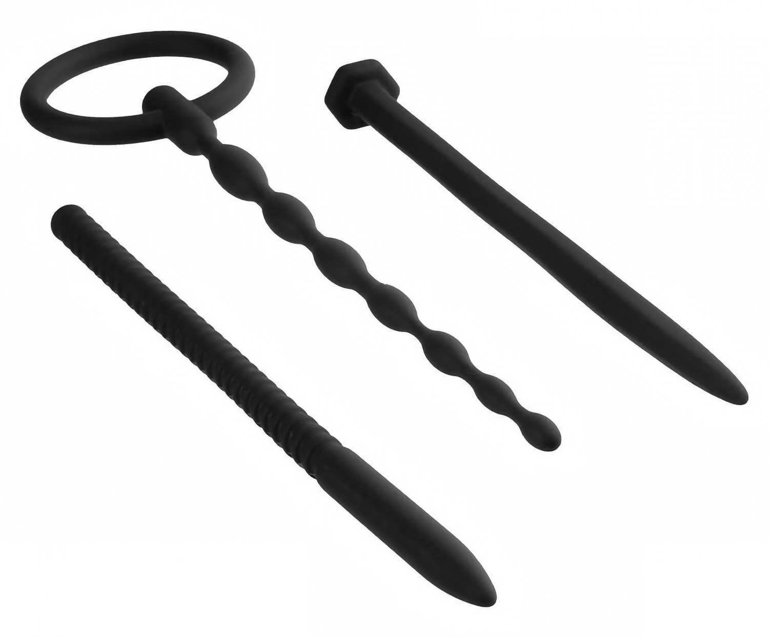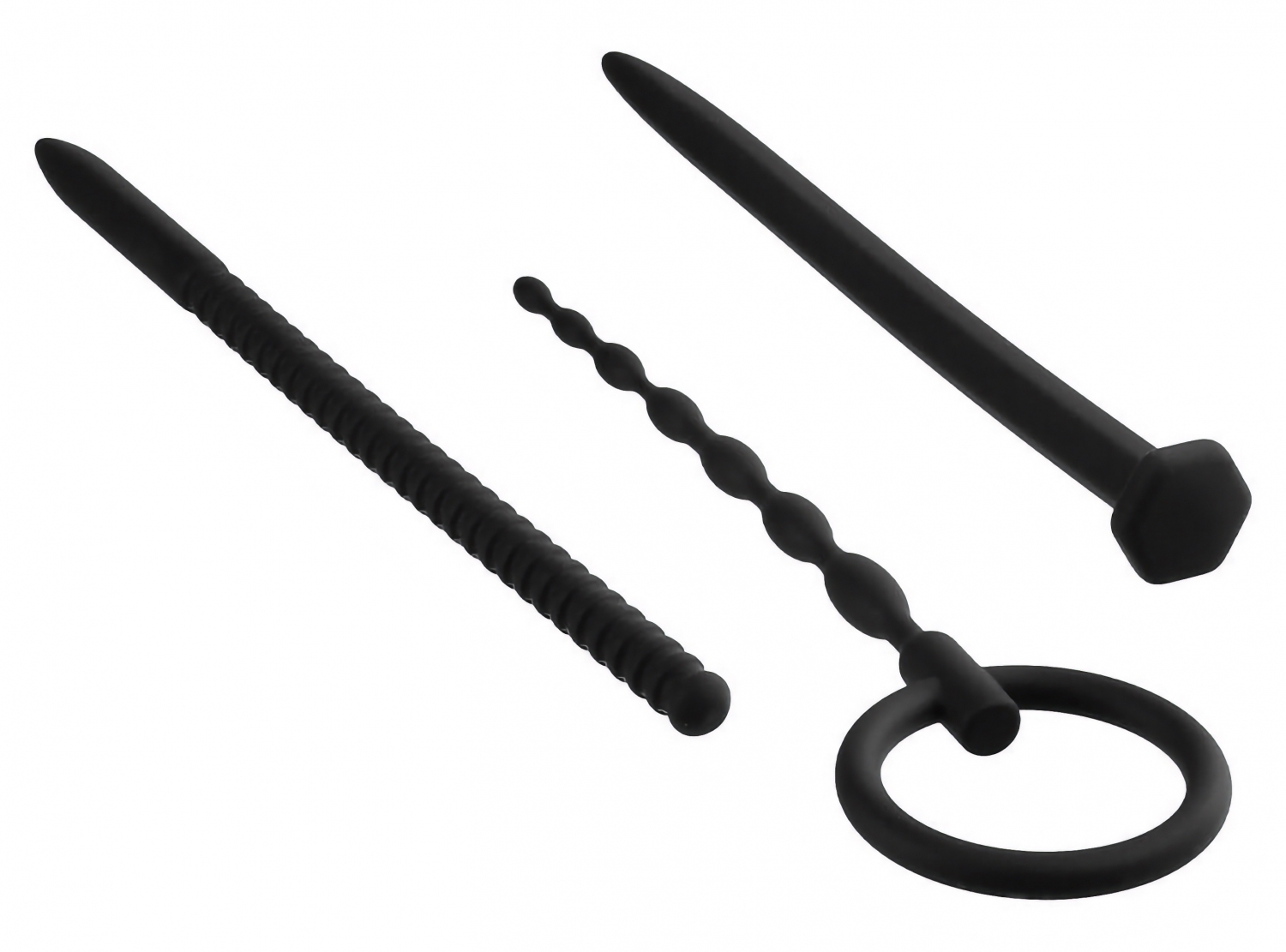 Set discret Nmc, 3 dilatatoare uretrale din silicon pentru progres treptat. Dimensiuni precise: 12,5 cm (cu inel, diametre 0,3–0,8 cm), 15,0 cm şi 15,2 cm (diametru 0,8 cm). Finisaje neted şi striat. Curăţare simplă; folosiţi agent lubrifiere pe bază de apă.