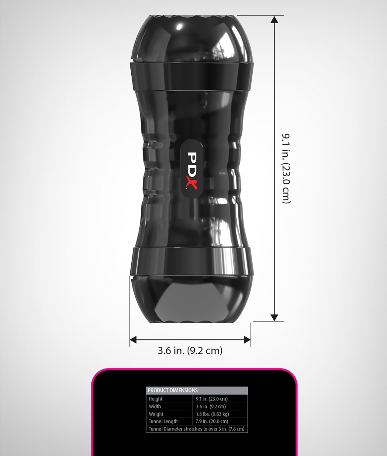 Lungime totală: 26 cm; Lungime inserabilă: 23.6 cm; Lățime: 10.2 cm; Interior maleabil până la 7.6 cm; Greutate: 870 g.