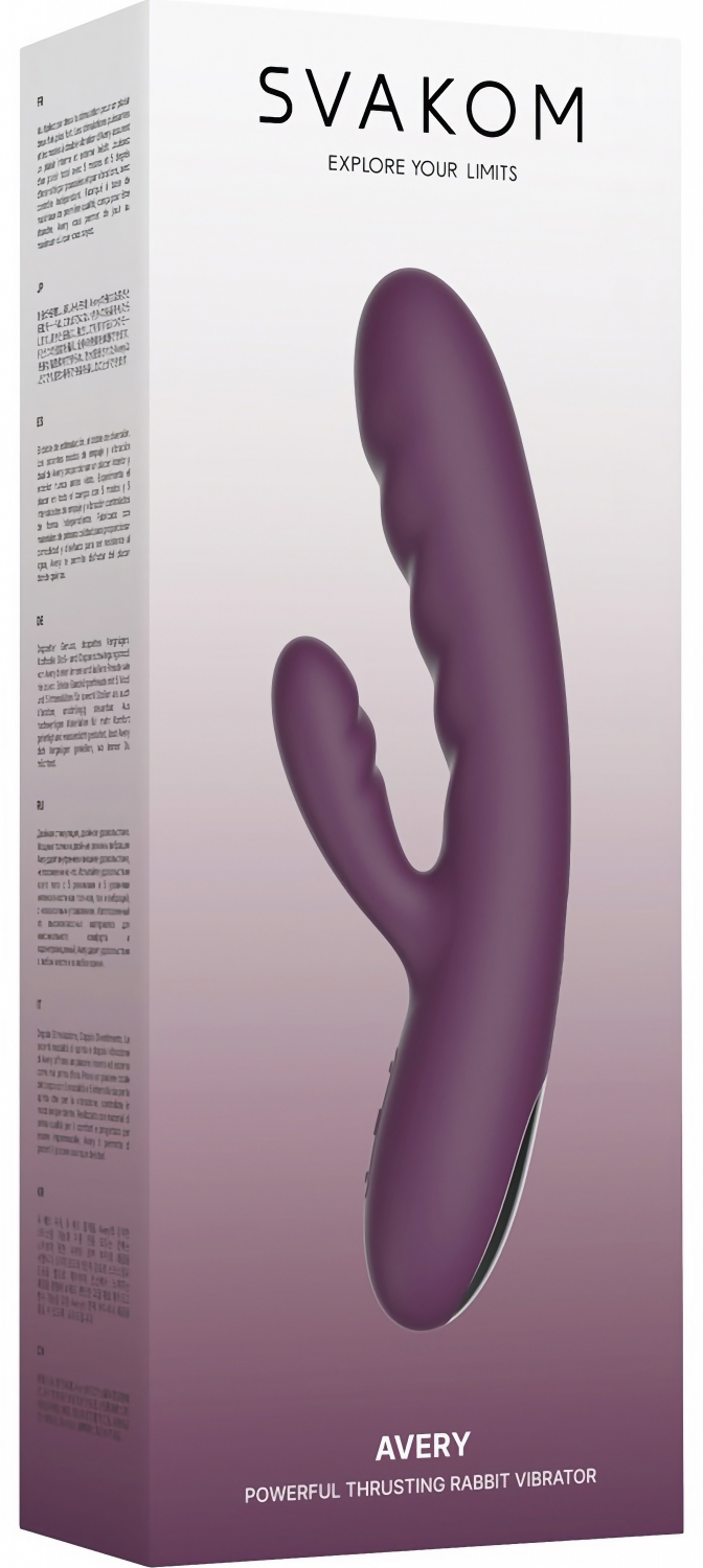 Svakom Avery Lilac este un rabbit reîncărcabil plămădit pentru stimulare duală: un cap viguros cu deplasare de împingere și un stimulator lateral flexibil. Funcțiile pot fi activate separat sau simultan, pentru reglaje precise adaptate preferințelor.