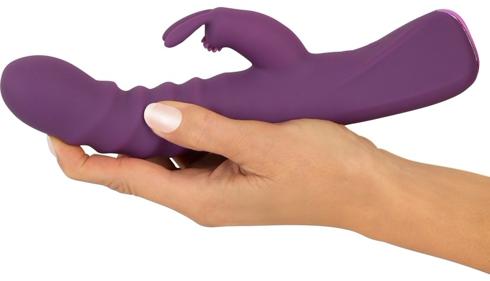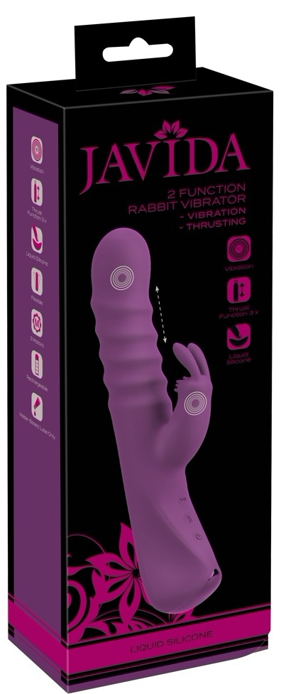 Rabbit cu acumulator JAVIDA cu arbore canelat și funcție de împingere, plus energizator clitoral punctat. Trei motoare silențioase: 10 moduri în vârf, 3 viteze de împingere și 10 moduri în stimulator. Silicon lichid, flexibil. Cablu USB inclus. Nu utiliza lubrifianți pe bază de silicon.