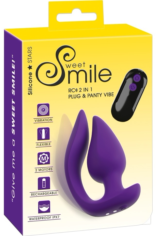 Discret și eficient: Sweet Smile Plug Panty 2în1 comasează un plug vibrator inserabil din silicon catifelat cu un element extern flexibil, purtabil în îmbrăcăminte pentru stârnire internă și externă simultană.