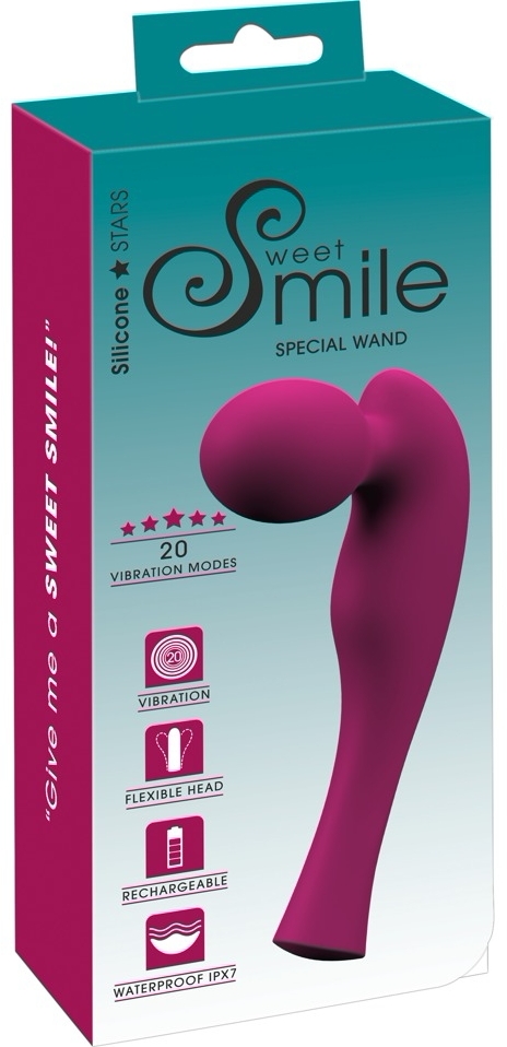 Masator compact Sweet Smile Excepțional Wand: motor voinic cu 20 moduri de vibraţie în 8 trepte, cap din silicon flexibil, mâner ergonomic, cu acumulator USB şi rezistent la apă. Compact, uşor de întrebuințat şi întreţinut.