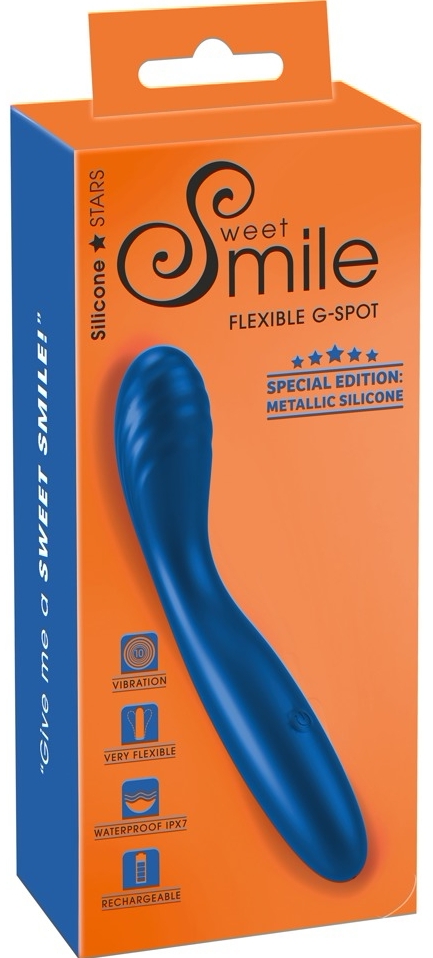 Vibrator Punct G flexibil Sweet Smile, din silicon delicat cu finisaj metalic. Cap curbat, foarte flexibil pentru stârnire precisă, 10 chipuri silențioase și cu acumulator USB. Rezistent la apă, compact și ușor de curățat.