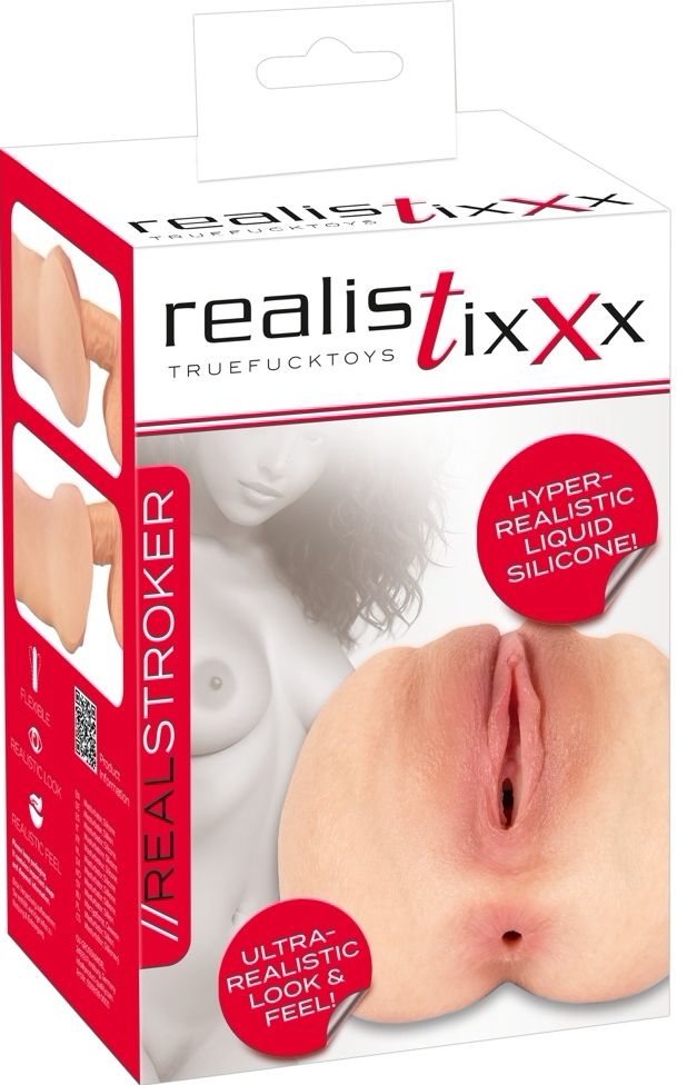 Masturbator Realistixxx Real Stroker, compact, cu două canale elastice din silicon lichid. Textură foarte moale, detalii anatomice realiste și tunel închis pentru un rezultat fără greutate de aspirație. Extindere radicală 17,5 cm, inserabil 13,5 cm.