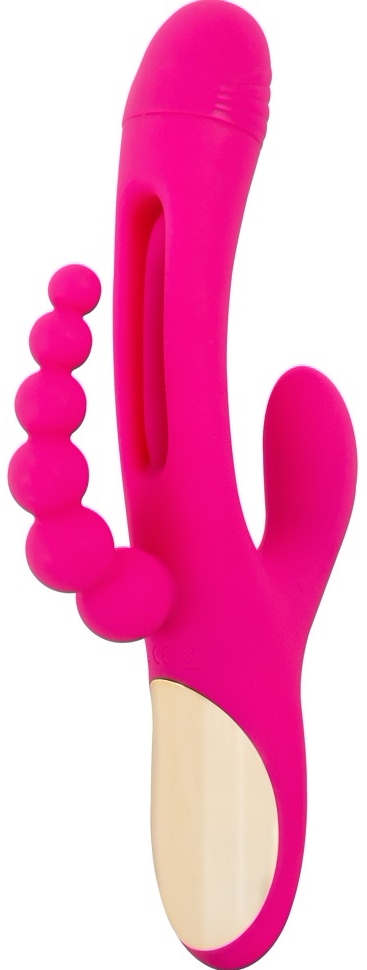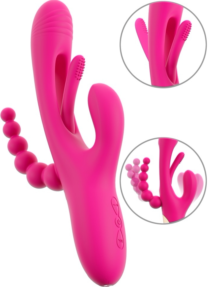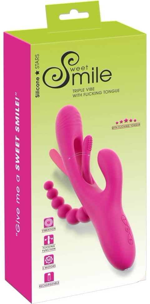 Triple Vibe Flicking de la Sweet Smile oferă stârnire triplă: interior, clitoris și zonă anală. Trei brațe cu 3 motoare silențioase, Flicking Tongue cu 7 viteze și 7 moduri, control separat, reîncărcabil USB, silicon catifelat. Hands-free.