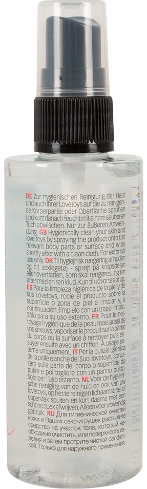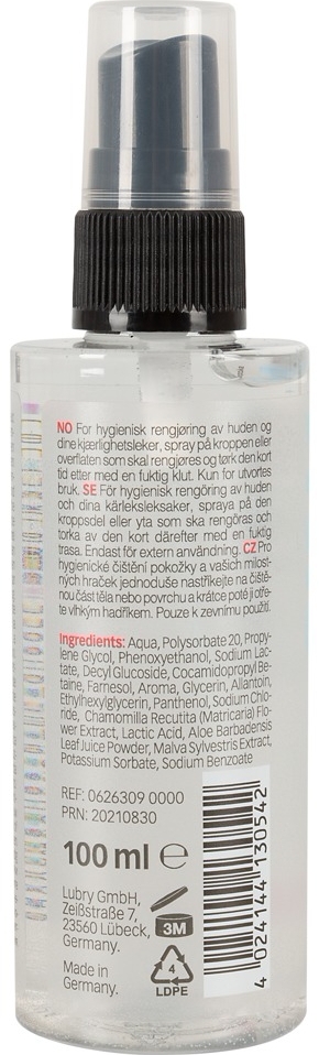 Atomizator 2în1 Just Play — curăță delicat zona sexuală și jucăriile erotice. Rețetă blândă, lipsit de parfum, cu extras de nalbă, mușețel și aloe vera. Vegan, 100 ml. Pulverizați, lăsați să acționeze și ștergeți cu prosop umed.