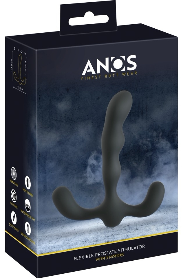Plug anal ANOS, 3 motoare, 7 moduri; reîncărcabil USB, impermeabil, din silicon, flexibil. Lungime totală 13 cm, inserabil 10 cm, calibru 1–2.5 cm.