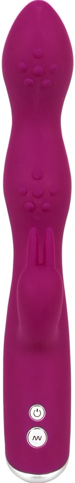 Vibrator Sweet Smile Rabbit: 3 motoare independente și 7 moduri pentru stimulare A (AFE) și G, plus stimulator clitoridian. Shaft flexibil cu capete texturate, silicon moale. Extindere 23.6 cm (inserabil 15 cm). Funcționează cu 2 x AAA (nu sunt incluse).