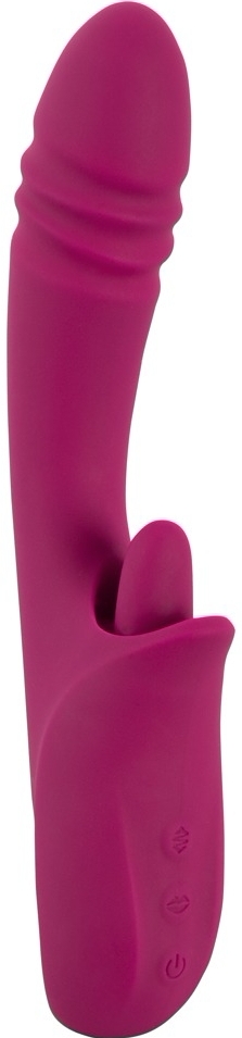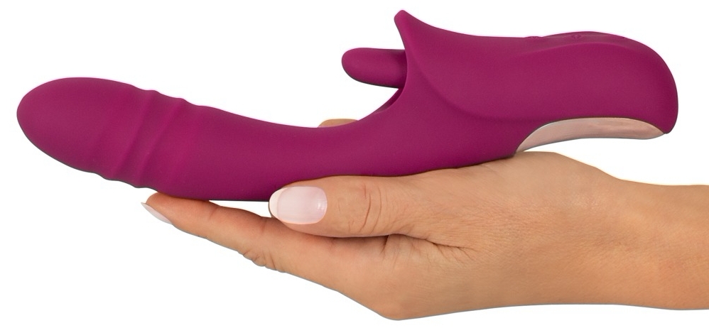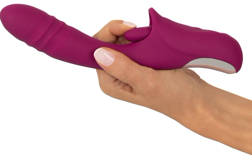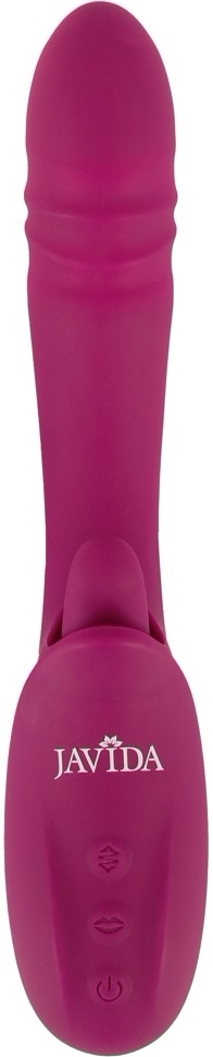 Stimulator JAVIDA Licking Thrusting: stimulare simultană internă şi externă. Limbă vibro cu 10 moduri, vârf cu 10 moduri de împingere, 3 motoare silenţioase, Turbo starter şi cu acumulator USB. Silicon moale, flexibil, durabil la stropiri.
