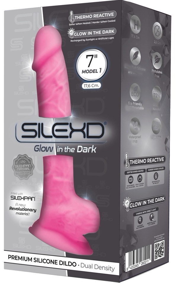 Pink 7 de la SILEXD: penis virtual din silicon Silexpan, 17.6 cm, cu rod strălucitor în întuneric. Formă hiper-realistă, ferm dar flexibil, urmare de memorie și reacție la temperatură. Bază cu pompă puternică, corespunzător cu hamuri; pentru penetrare vaginală și anală.