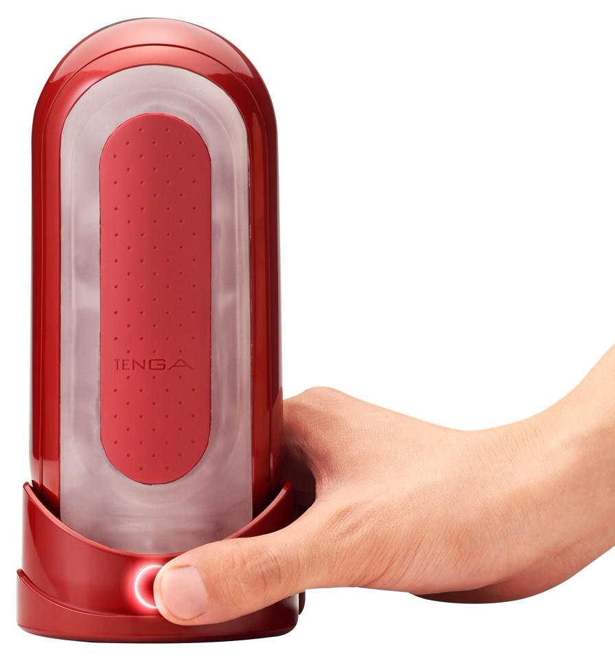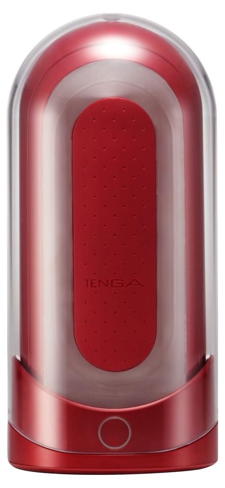 Set Tenga FLIP 0 Red cu încălzitor FLIP WARMER: cilindru din gel moale cu texturi dense, încălzire în 5–6 minute, două trepte, design pliabil pentru curățare facilă și suport pentru uscare. Include adaptor, carcasă și 2 mostre lubrifiant.
