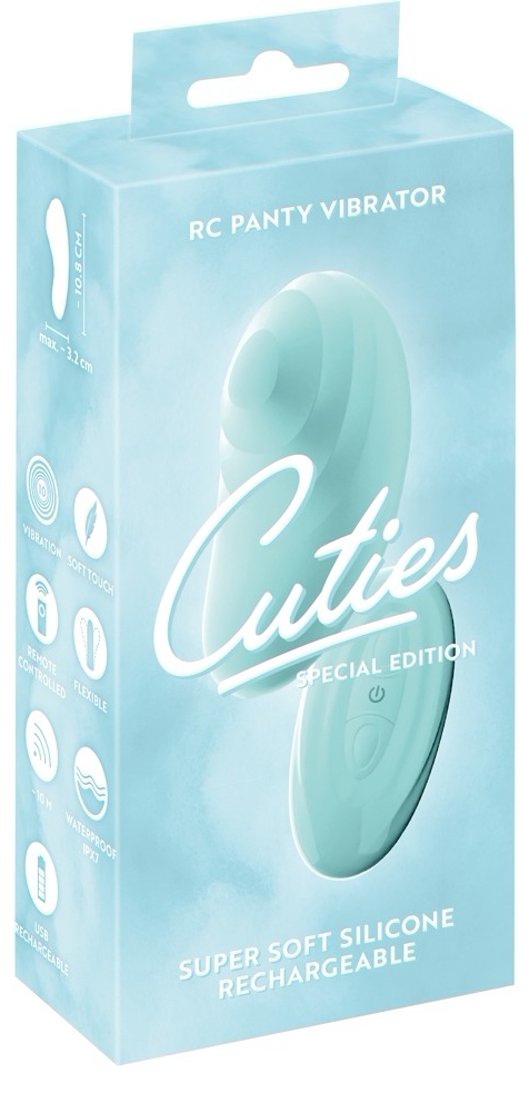 Vibrator Cuties RC Panty, moale și flexibil, cu motor dominant și 10 feluri de vibrație. Discret, insonor și reîncărcabil, include telecomandă și cablul USB; rezistent la apă, poate fi purtat în chiloți pentru stimulări surprinzătoare.