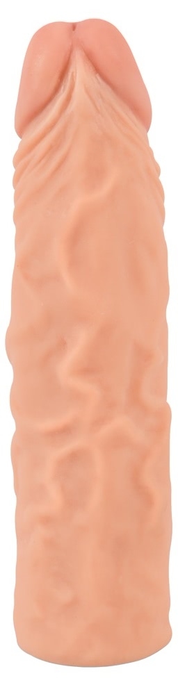 Extensie realistică Nature Skin din TPR, care adaugă +3 cm și îngroașă aproximativ +2 cm. Stil anatomic cu cap pronunțat și vene vizibile, potrivire strânsă pentru susținere. Extindere desăvârșită 19.5 cm, inserție max. 16.5 cm, calibru partea interioară 2.5 cm. Se curăță ușor; folosiți lubrifiant pe bază de apă.