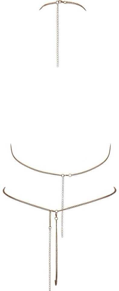 Barete reglabile la gât, spate și pentru tanga, cu câte 3 închizători pentru ajustare precisă. Lanțurile se așază pe corp pentru a sublinia formele; pot fi purtate discret peste haine sau singure pentru un look mai îndrăzneț.