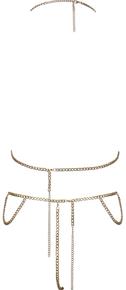 Set din lanț metalic auriu: top halter și string cu decorațiuni pe bust, brâu și șolduri. Lanțurile se reglează cu carabiniere; se poartă solitar ca accesoriu sexual sau combinat cu costume de baie și ținute mulate.