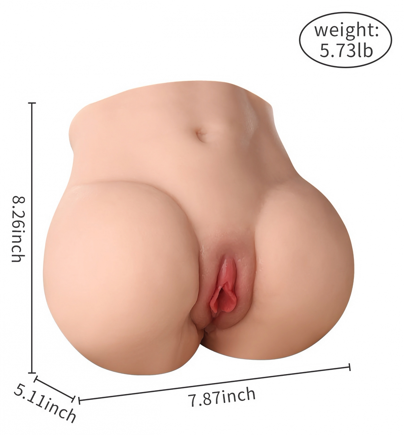 Forma anatomică conține două deschideri: una frontală, cu contururi realiste, și una anală, pentru stârnire variată. Greutatea totală de 2,8 kg asigură stabilitate și o poziție fermă în timpul utilizării, reducând alunecarea.