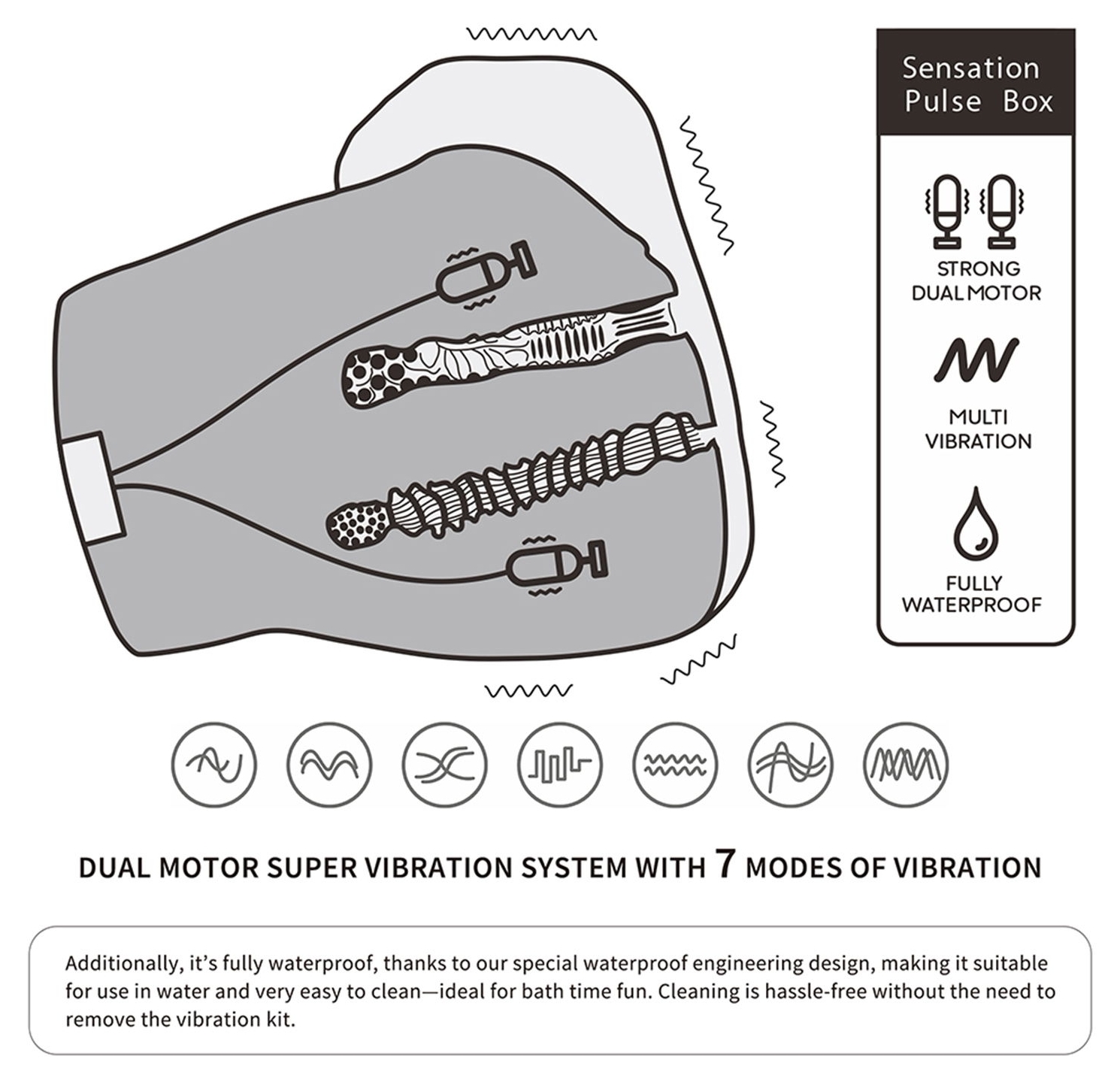 Deschidere modelată cu textură internă detaliată, făcută pentru senzații realiste și confort sporit. Carcasa rezistentă la apă îngăduie întrebuințare în medii umede și curățare ușoară excluzând a fi neapărată demontarea modulului de vibrații.