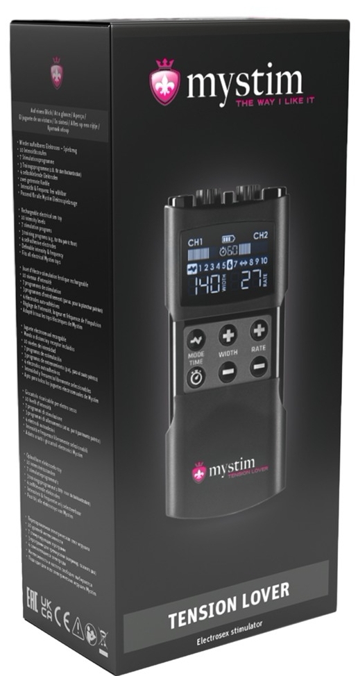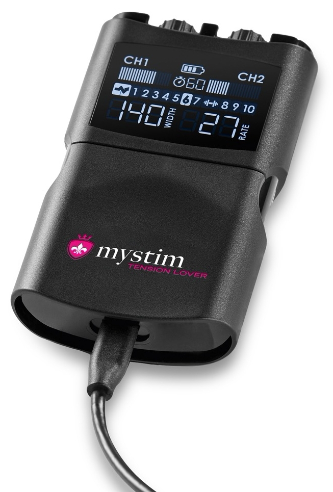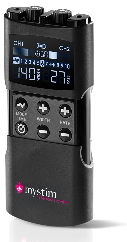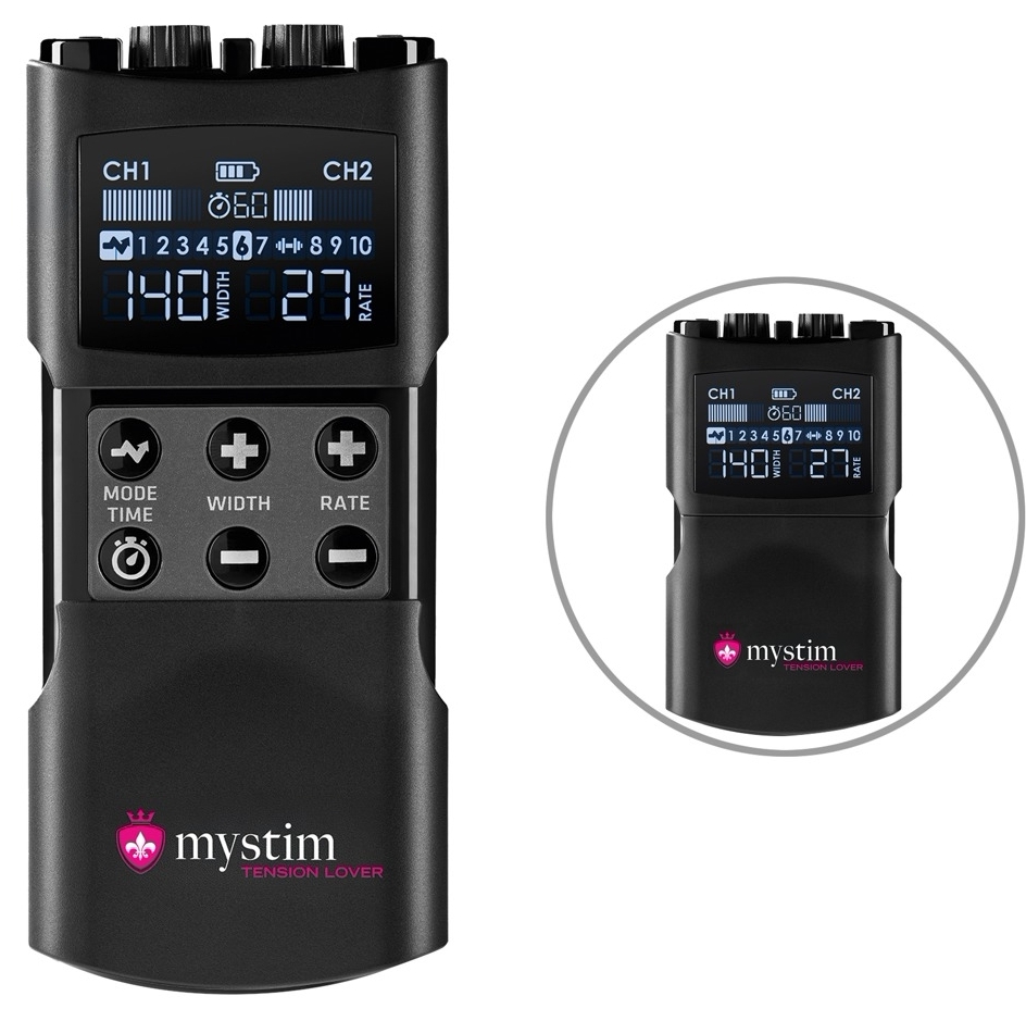Aparat EStim reîncărcabil, compact, Mystim Tension Lover 2: 2 canale independente, 7 programe de stimulare și 3 de antrenament, reglaje pentru intensitate, lățime impuls 50–260 µs și frecvență 1–160 Hz. Include 4 electrozi reutilizabili, 2 cabluri și cablu USB-C.