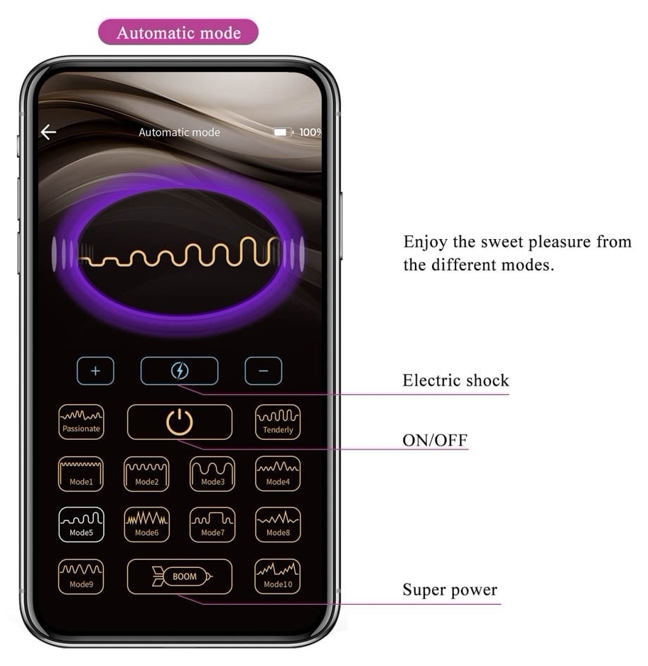 Se controlează wireless prin Bluetooth, folosind aplicația dedicată (scanare QR pe ambalaj). Oferă 12 maniere de vibrație și 3 chipuri de electrostimulare pentru reglaje precise ale intensității și ritmului.
