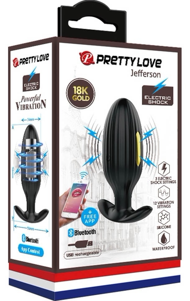 Dop anal Pretty Love Jefferson: formă conică, cap elastic și mâner pentru poziționare ușoară. Control Bluetooth prin aplicație, 12 maniere de vibrație și 3 moduri de electrostimulare. Material silicon și ABS, reîncărcabil, rezistent la apă.