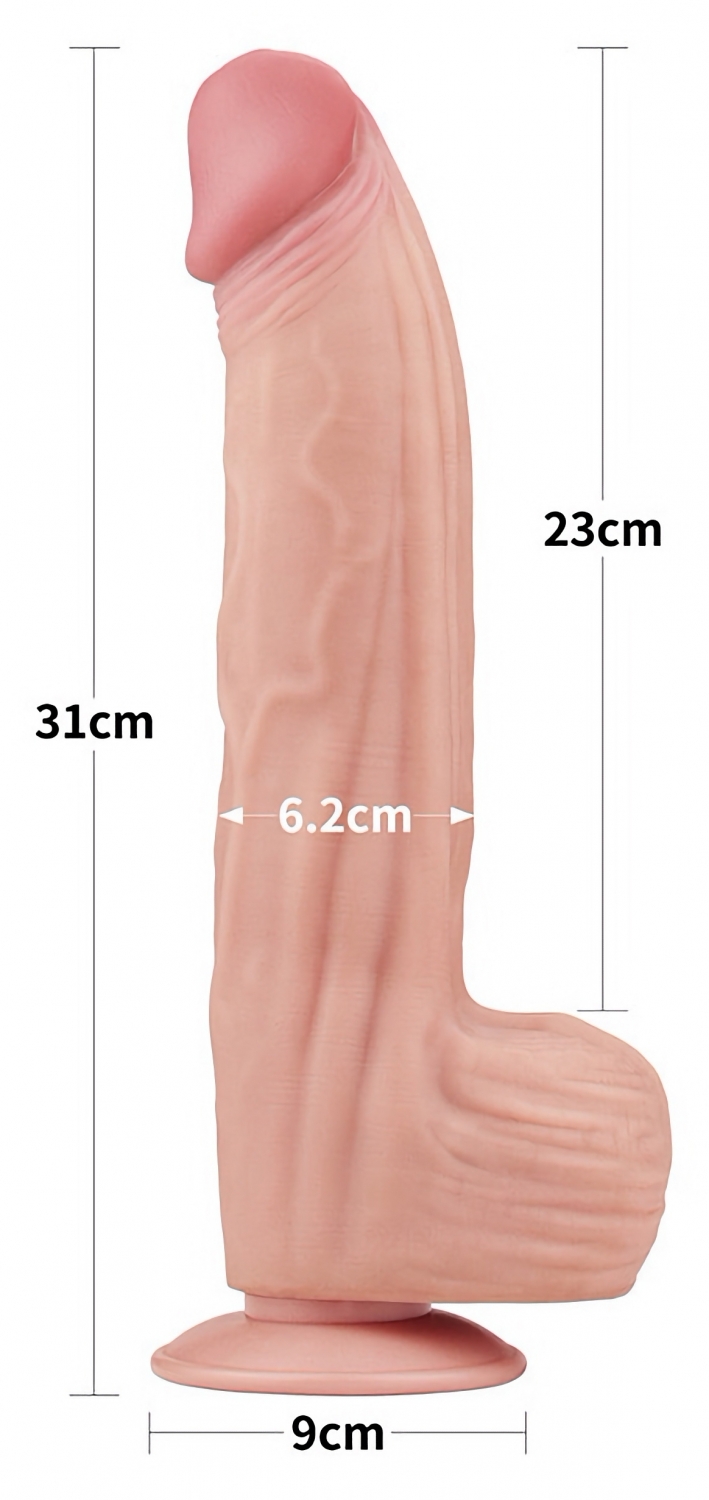 Jucărie realistică din TPE cu dublu strat, 31 cm mărime şi calibru 6,2 cm. Exterior moale, miez ferm şi foarte flexibil, cu ventuză detaşabilă pentru stabilire stabilă. Compatibilă cu lubrifianţi pe bază de apă; se curăţă uşor.