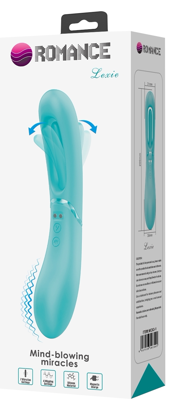 Vibrator Pretty Love Lexie, optimizat pentru stimularea punctului G: motor cu mișcări fluttering în ax și vibrații la capăt. 7 moduri de vibrație + 4 moduri flutter, control cu două butoane, silicon moale și încărcare magnetică USB. Propus agent lubrifiere pe bază de apă. Culoare: albastru.