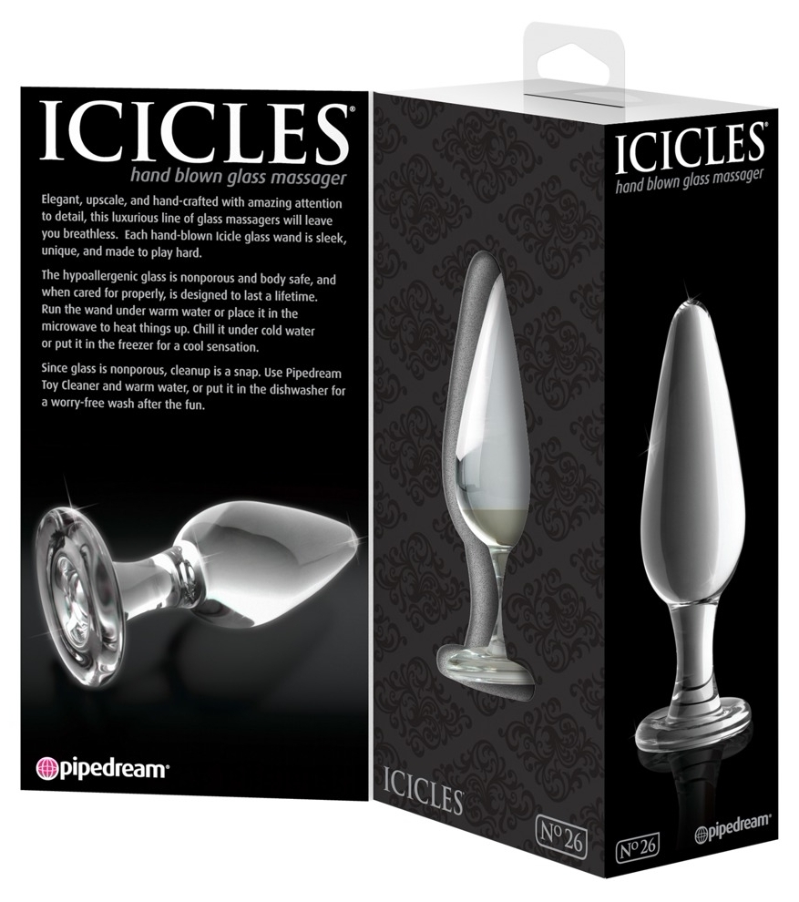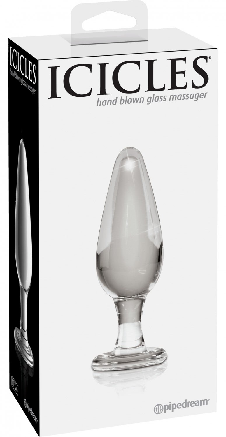 Anal Plug confecționat din geam pentru cei care vor o practică specială. Este dur, însă destul de alunecos atunci când este lubrifiat și oferă momente de ținut minte utilizatorului. Fiind făcut din sticlă, plugul Icicles poate fi încălzit sau răcit la temperatura care îți dorești excluzând să îți faci griji că se deteriorează materialul. Are forma conică, ceea ce asigură desfătare atunci când este introdus, dar și când este scos.