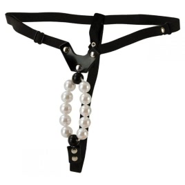 Lenjerie intimă femei, chiloți negri nice și eleganți, cu lanț și perle decorative, deschis în zona intimă.